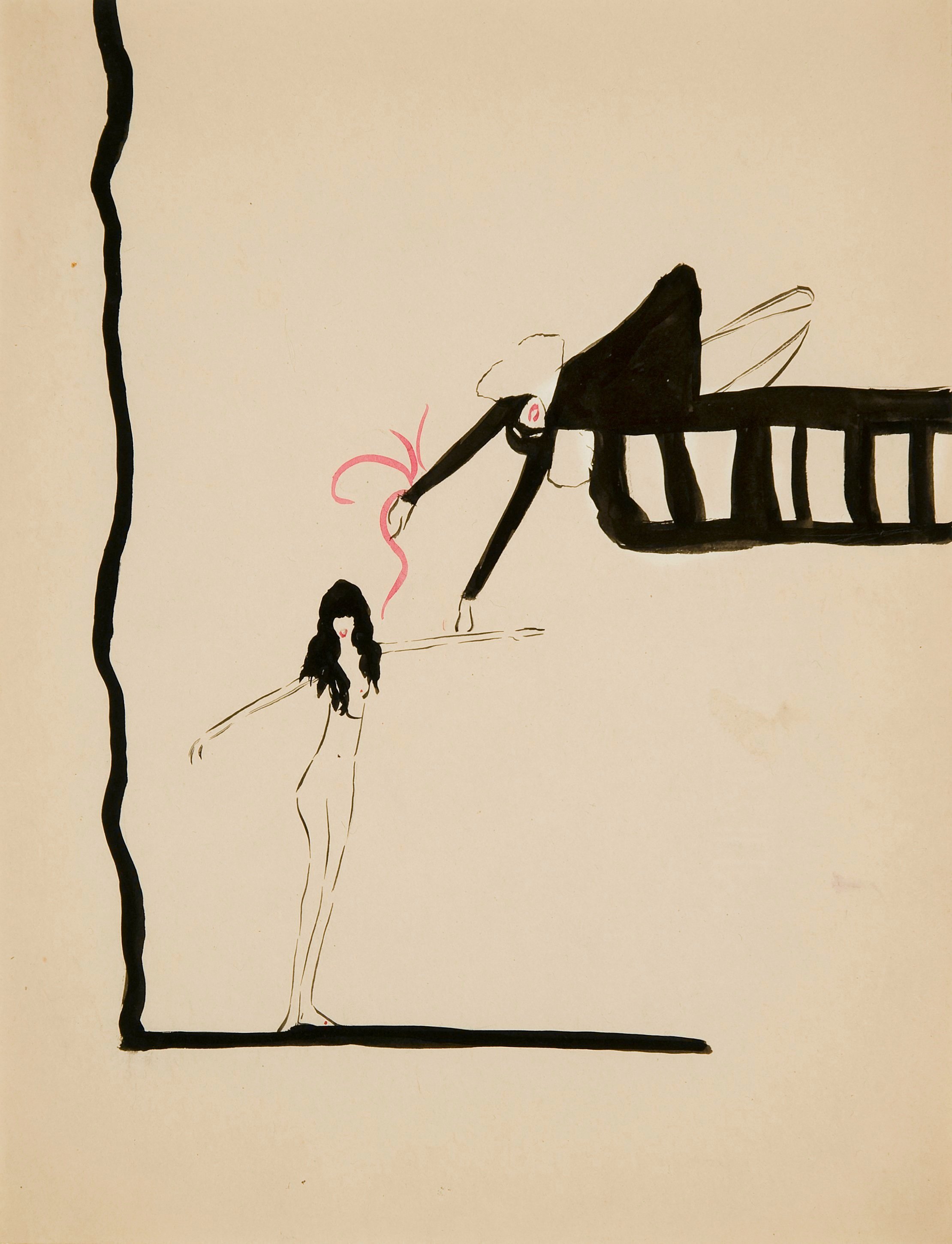 Women Breaking Through # Spring 2021 <alt="Ink drawing of harlequin holding a ribbon leaning over a balcony towards a nude woman">